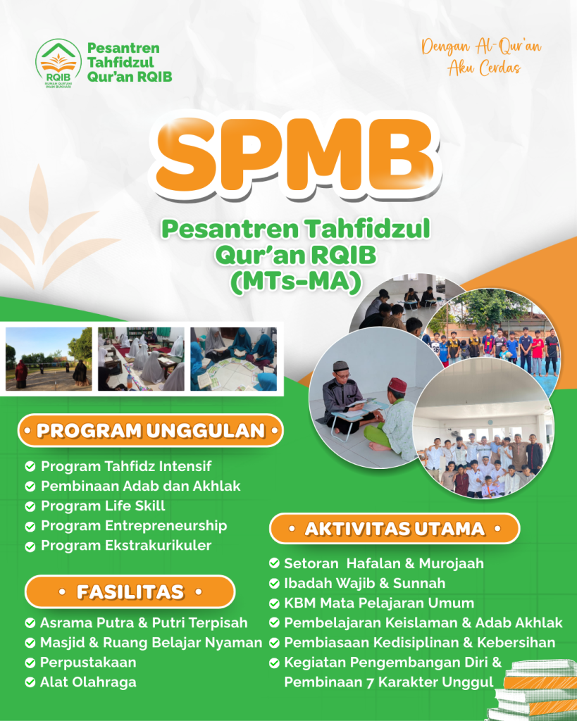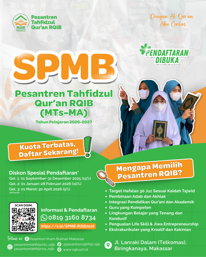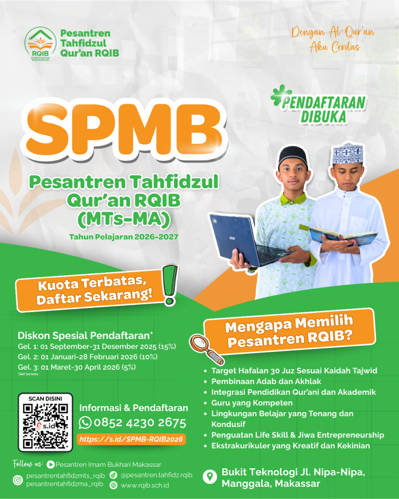 Pesantren Tahfidzul Qur’an RQIB Makassar kembali membuka Penerimaan Santri Baru (SPMB) untuk tahun pelajaran 2026–2027. Program ini ditujukan bagi siswa tingkat MTs (SMP) dan MA (SMA) yang ingin menempuh pendidikan dengan fokus utama pada hafalan Al-Qur’an dan pembinaan karakter Islami.